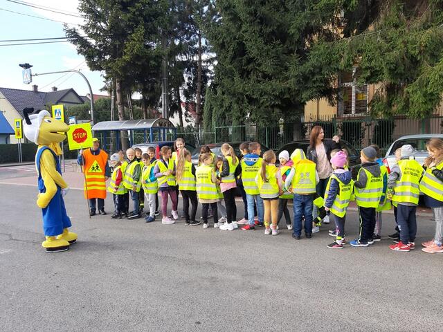 Na koniec prelekcji wszyscy wyszli na przejście dla pieszych, aby przećwiczyć w praktyce zdobytą wiedzę. Dzieci otrzymały odblaski na rękę, odblaskowe zawieszki na tornister i plany lekcji.