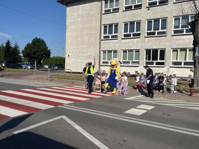 drugą stronę jezdni wraz z policją i maskotką mrówki.