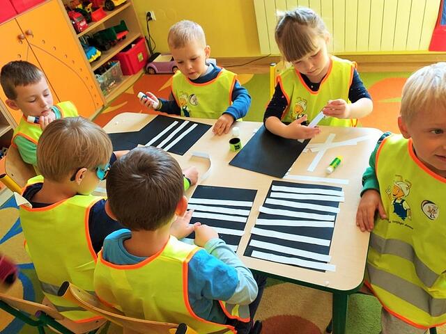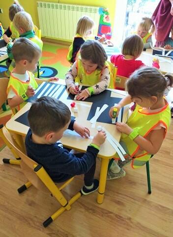 Zajęcia rozpoczęły się od przedstawienia dzieciom tematu przewodniego spotkania, a następnie maskotka zapoznawała się z grupą - każde dziecko mówiło swoje imię, a Mrówka w zamian rozdawała kamizelki oraz odblask na rękę. Następnie dzieci słuchały wierszyka o Trampolinku, który stosował się do zasad ruchu drogowego, a Mróweczka pokazywała im jak powinni się zachowywać na drodze wykorzystując do tego ,,sygnalizator świetlny” oraz matę, która imitowała przejście dla pieszych.