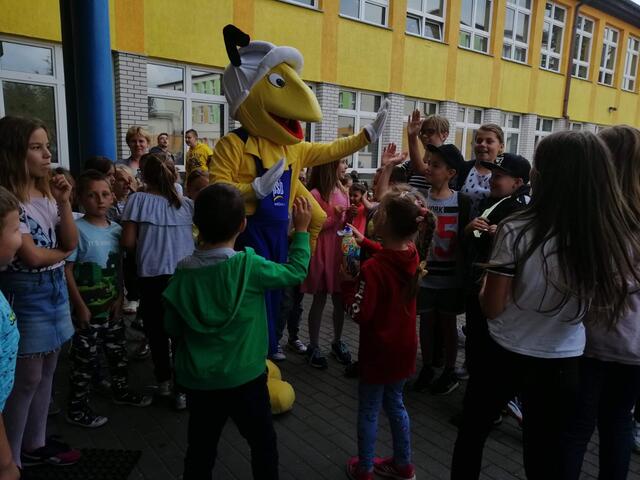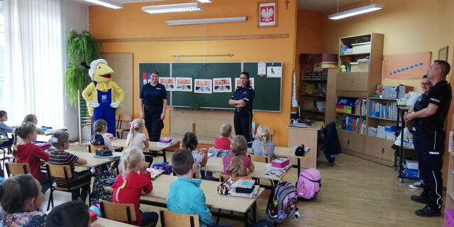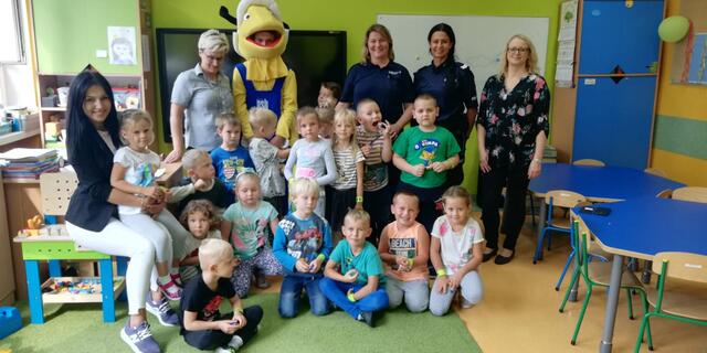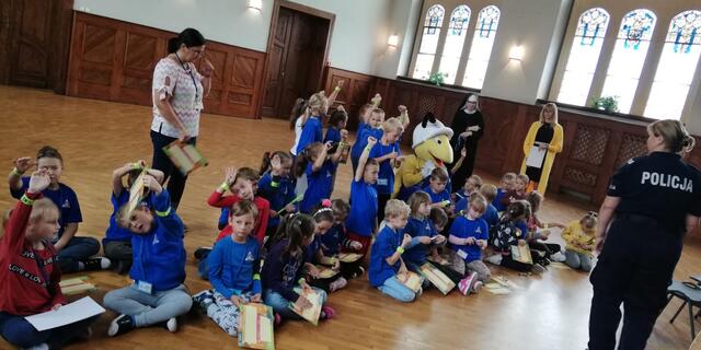 Dużym zainteresowaniem wśród maluchów cieszyła się nasza "Mrówka", która w trakcie przekazywania wiedzy merytorycznej asystowała dla przemiłych pań funkcjonariuszek w specjalnie zorganizowanych scenkach z przejścia przez jezdnię czy poruszania się po drodze. Poza tym każdy uczeń otrzymał od Mrówki zestawy "mrówkowych" odblasków zapewniające widoczność po zmroku. Nie zabrakło również firmowych kolorowanek, planów lekcji, a zwłaszcza słodyczy jakże cenionych przez najmłodszych.