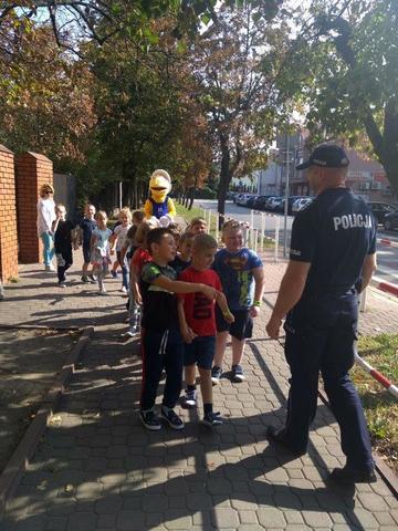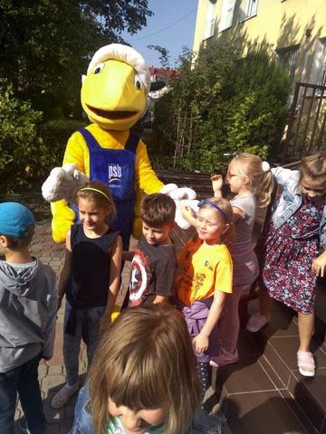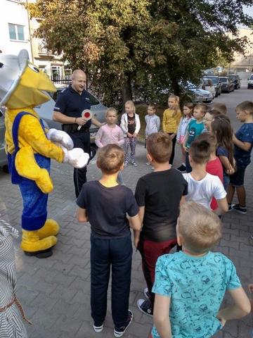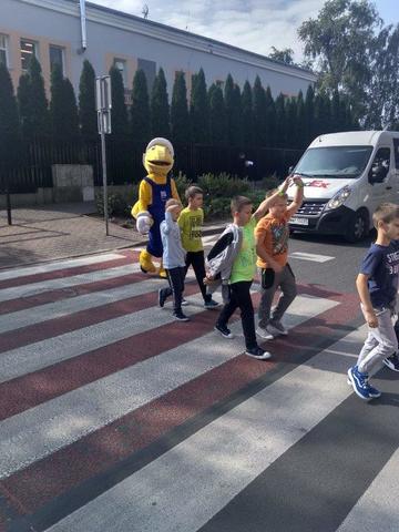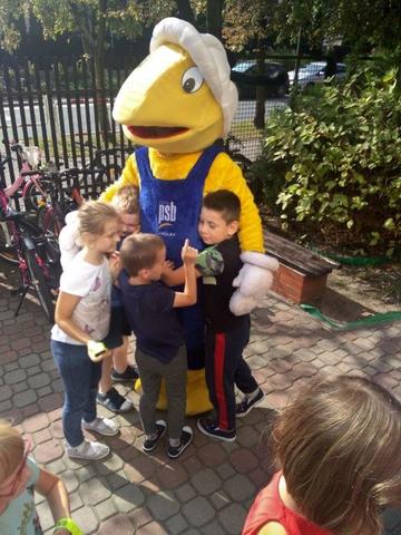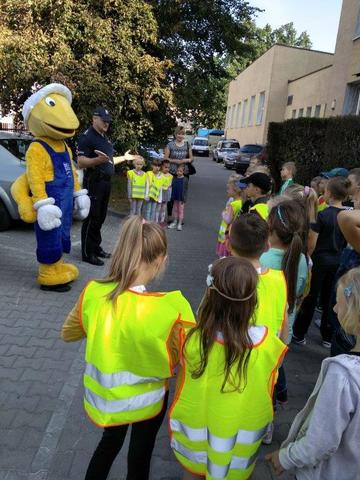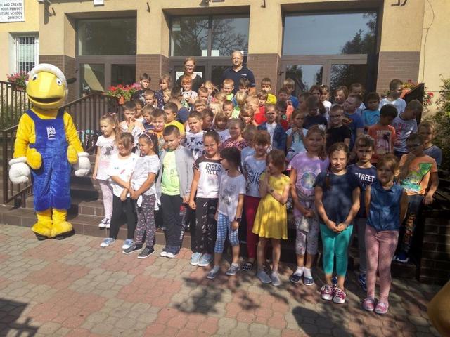 Mrówka asystowała policjantowi w wykładach na temat bezpieczeństwa podczas drogi do i ze szkoły. Dzieci, których łącznie było ponad dwieście otrzymały od Mrówki zestawy odblasków, a szkoła koszulki odblaskowe dla najmłodszych, które przydadzą się podczas spacerów poza szkołą.