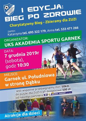 7.12.2019 r. w miejscowości Garnek odbyła się I edycja imprezy pt. "Charytatywny bieg po zdrowie", której organizatorem był UKS Akademia Sportu w Garnku. Jako jeden z głównych sponsorów była Mrówka Garnek. Wszystkie środki zebrane z wpisowego i dobrowolnych wpłat organizatorzy przekazali na leczenie 13-letniej Zuzi walczącej z nowotworem. W najśmielszych oczekiwaniach nikt nie spodziewał się takiej ilości chętnych do uczestnictwa w biegu, w którym udział brali ludzie z Myszkowa, Częstochowy, Katowic, Żarek, Radomska czy Łodzi. Łącznie w biegu udział wzięło 362 biegaczy.
