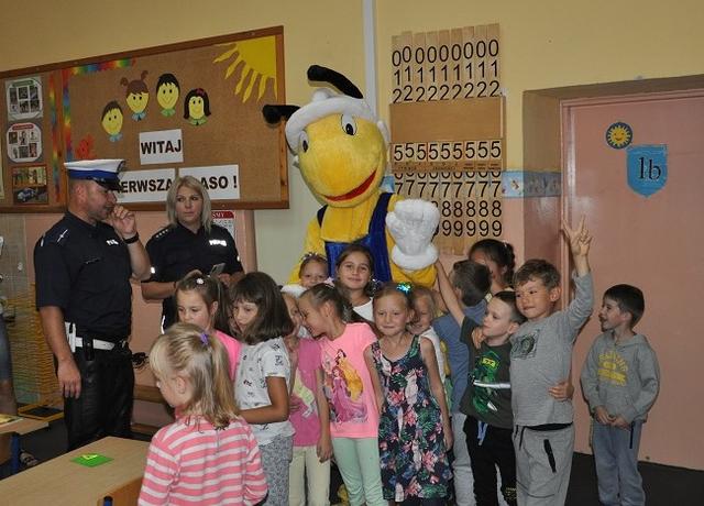 Mrówka chętnie dołączyła do pierwszaków, szkoliła się z nimi, a na koniec wręczyła wszystkim dzieciom w ramach akcji odblaski oraz drobne upominki.