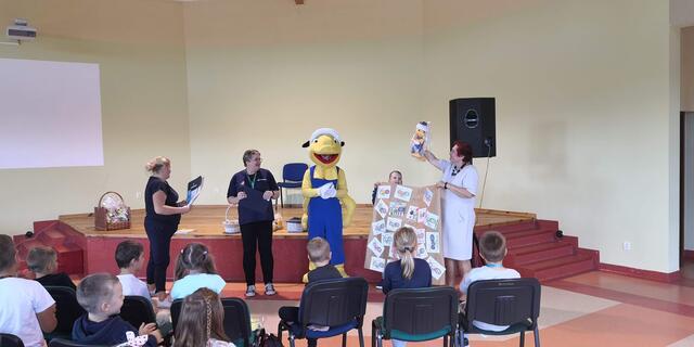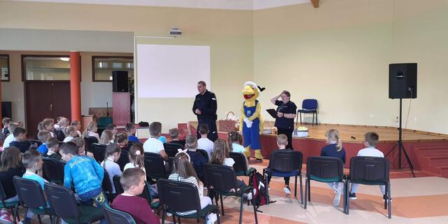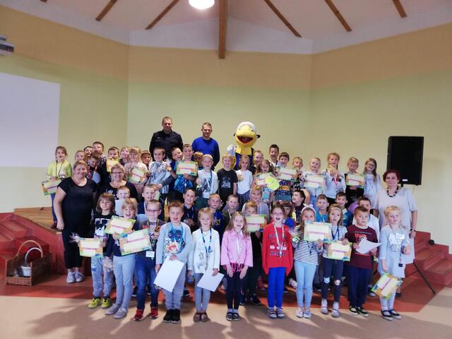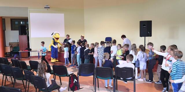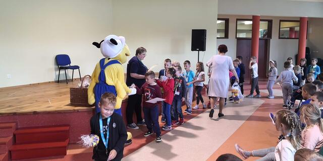 Podsumowaniem spotkania było wręczenie każdej klasie pluszowej maskotki Mrówki za pracę plastyczne, które wcześniej przygotowali na temat bezpiecznej drogi do szkoły.