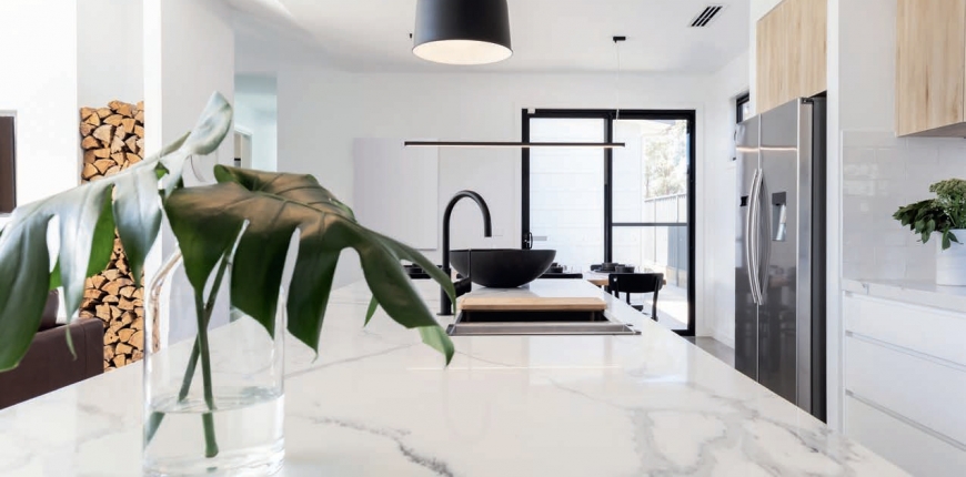 Znakiem rozpoznawczym marmuru jest charakterystyczny żyłkowany wzór. Rysunek może być bardzo wy - raźny w postaci długich „żył” lub też znacznie delikatniejszych rzadko rozsypanych i  prawie niewidocznych przebarwień. Podłużne użylenia są pochodną warstwowej budowy tej skały. Marmurowi przypisana jest również jasna kolorystyka, najczęściej w odcieniach bieli, która uznawana jest za klasykę. Jego ojczyzną jest region basenu Morza Śródziemnego. Do najbardziej dekoracyjnych i szlachetnych wśród białych marmurów z pewnością należy ten pochodzący z  włoskiej Carrary, który wyróżnia czysta lub jedynie pokryta delikatnymi przebarwieniami powierzchnia. Za jej sprawą wnętrze staje się nie tylko eleganckie, ale też optycznie większe i bar - dziej świetliste. Równie efektowny, chociaż mniej oczywisty może być marmur w odcieniach szarości aż po ciemny grafit, który doskonale wpisuje się w panujące obecnie trendy aranżacyjne. Szary marmur jest często bogato użyłkowany, co dodatkowo czyni go atrakcyjnym elementem wykończenia wnętrz minimalistycznych czy industrialnych. Skały w tej gamie kolorystycznej są sprowadzane m.in. z Indii oraz Hiszpanii. Do klasyki można też zaliczyć marmury w  odcieniach beżu, które są nie tylko uniwersalne, ale też dodają wnętrzom ciepła i przytulności. Mniej popularne są elementy wykończenia z marmuru w kolorze żółtym, różowym czy zielonym.